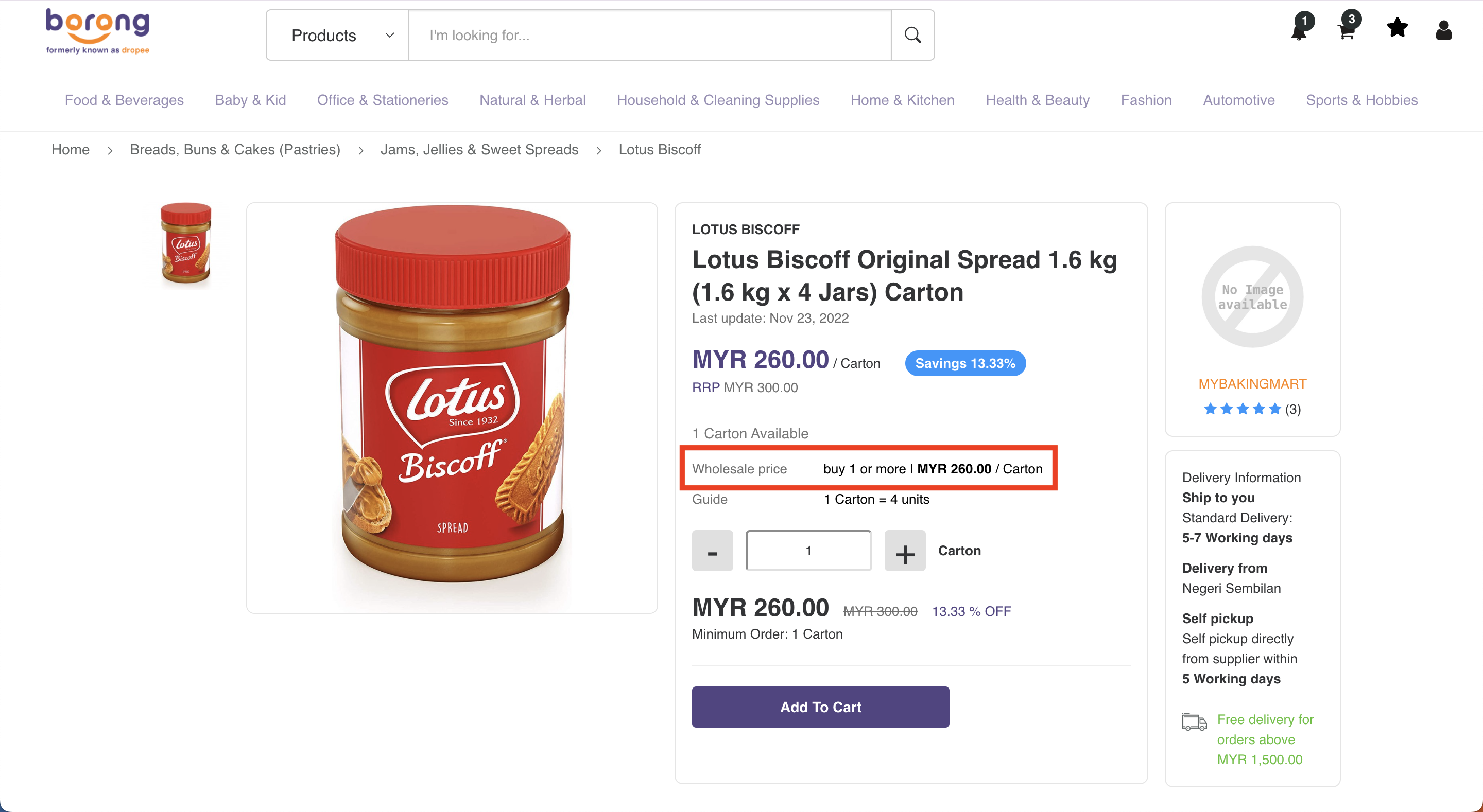 Prices are as per displayed on the website, however, buyers are able to request a quotation for purchases of more than 100 cartons of the same item via email at contact@borong.com.