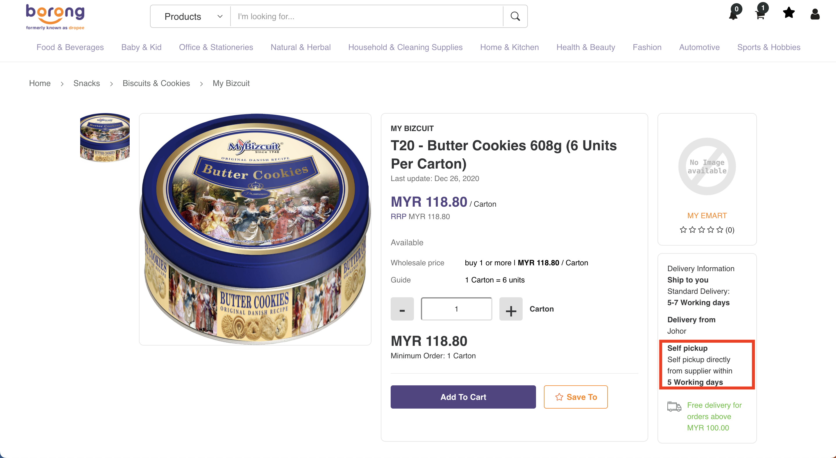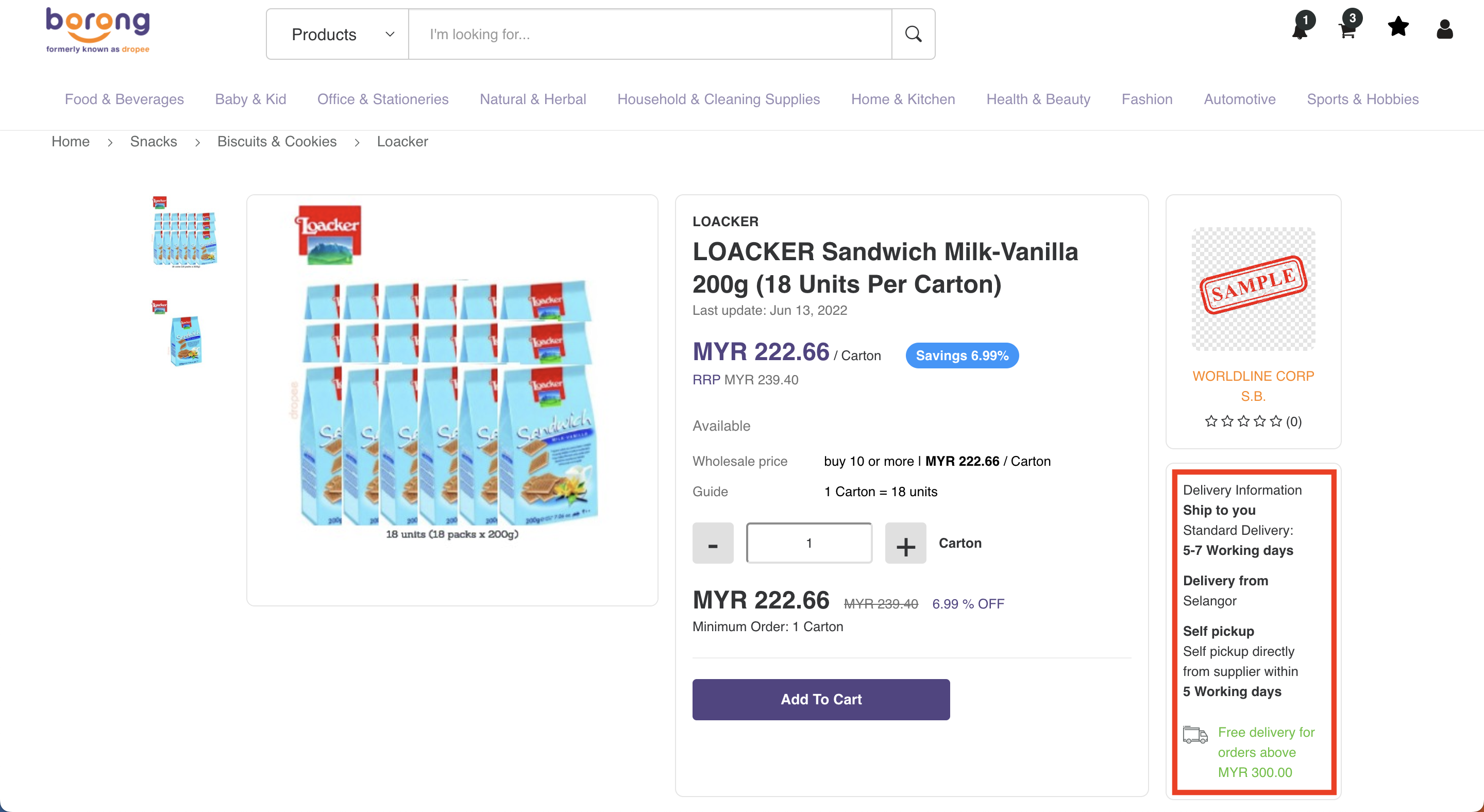 Borong is able to fulfil orders to all parts of Malaysia, as we are partnering with multiple Third-Party Logistics (3PL) partners. Do note that the delivery lead time from one state to another will vary.